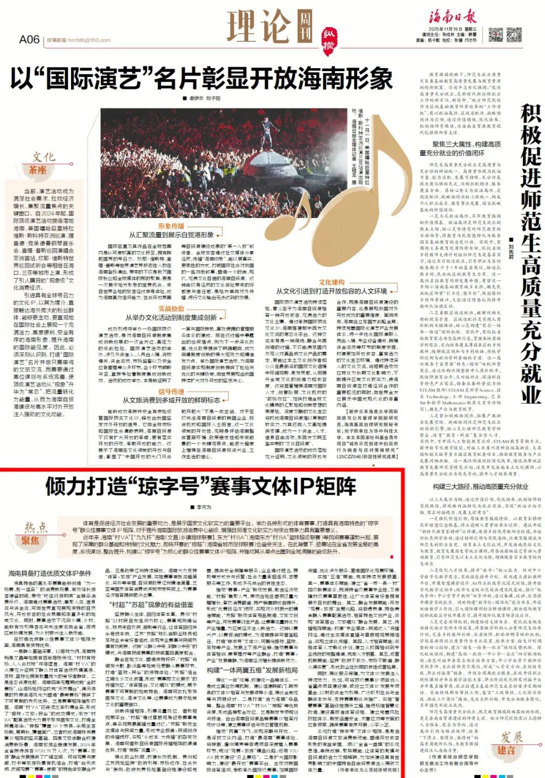 近年来,海南“村VA”【“九九杯”海南(文昌)乡镇排球联赛】、东方“村BA”(海南东方“村BA”篮球超级联赛)等民间赛事蓬勃兴起,展现了深厚的群众基础和独特的文化魅力,即将开赛的“琼超”(海南省城市足球联赛)也备受关注。在此背景下,亟需站在全省发展全局的高度,系统谋划、整合提升,构建以“琼字号”为核心的群众性赛事文体IP矩阵,并推动其从单点出圈到全域沸腾的能级跃升。