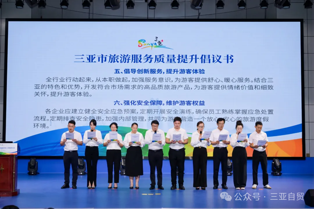 会议还公布了96名“旅游服务质量提升评审委员会专家”和135名“旅游服务质量体验官”名单,并对其中10名评审专家和10名体验官颁发聘书;三亚市旅游行业协会联合会等十家行业协会代表共同上台,向全市旅游行业发出联合倡议,号召全行业齐心协力,为游客打造“放心、安心、暖心、舒心”的旅游度假环境。